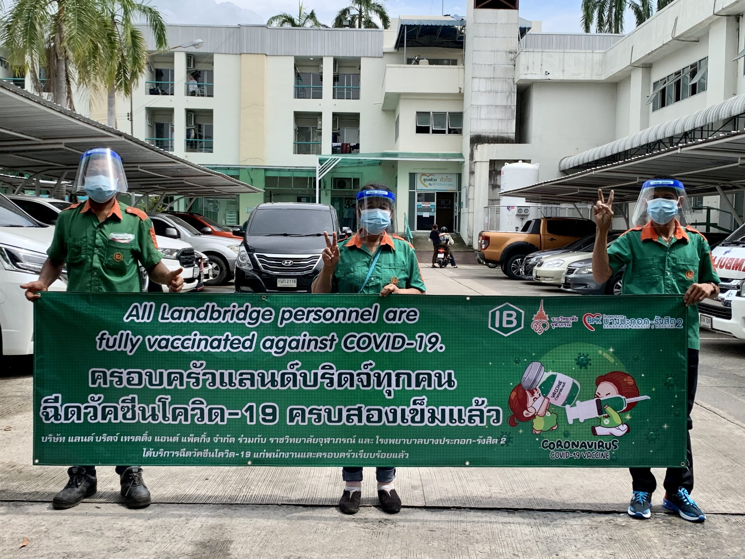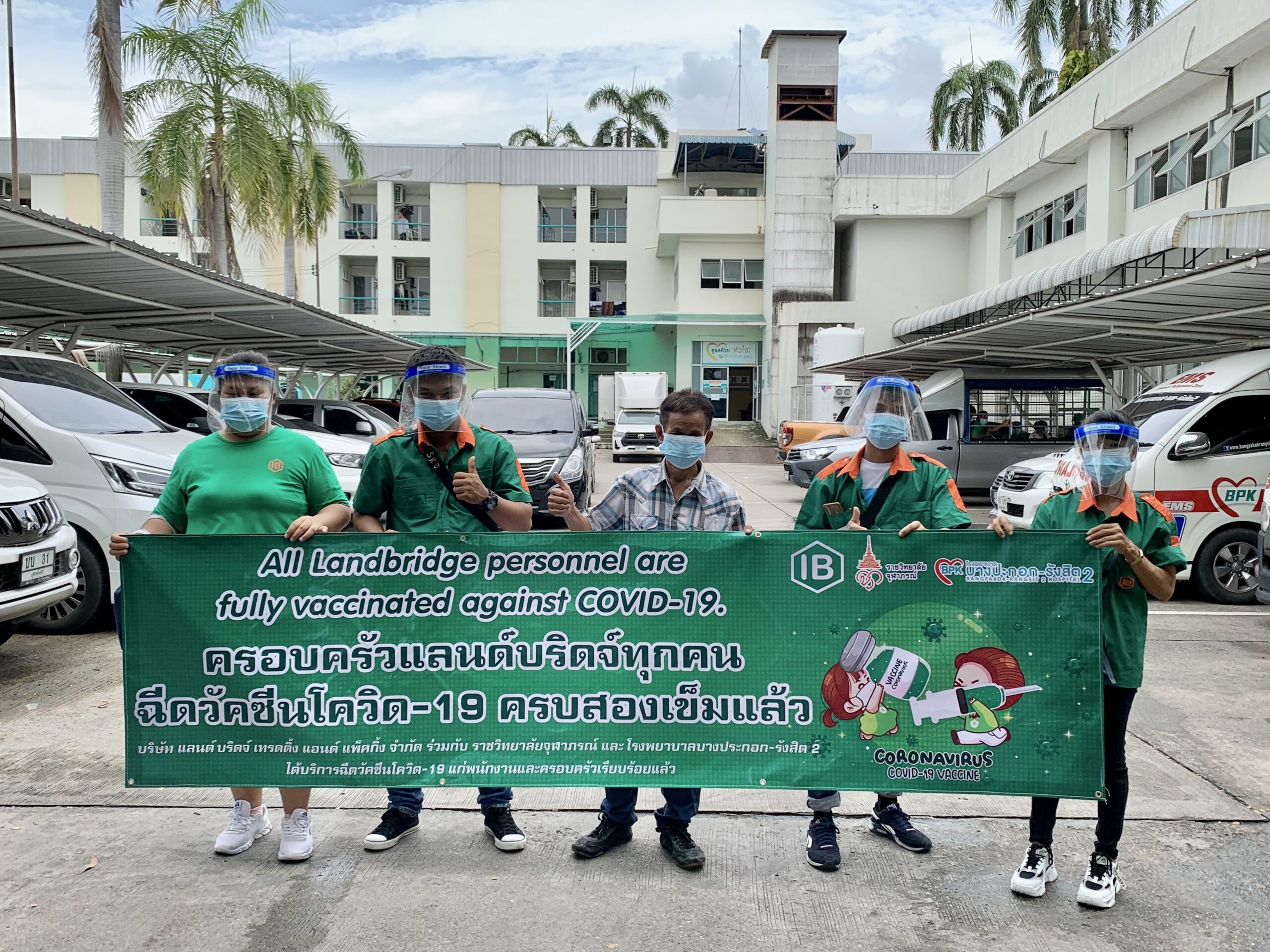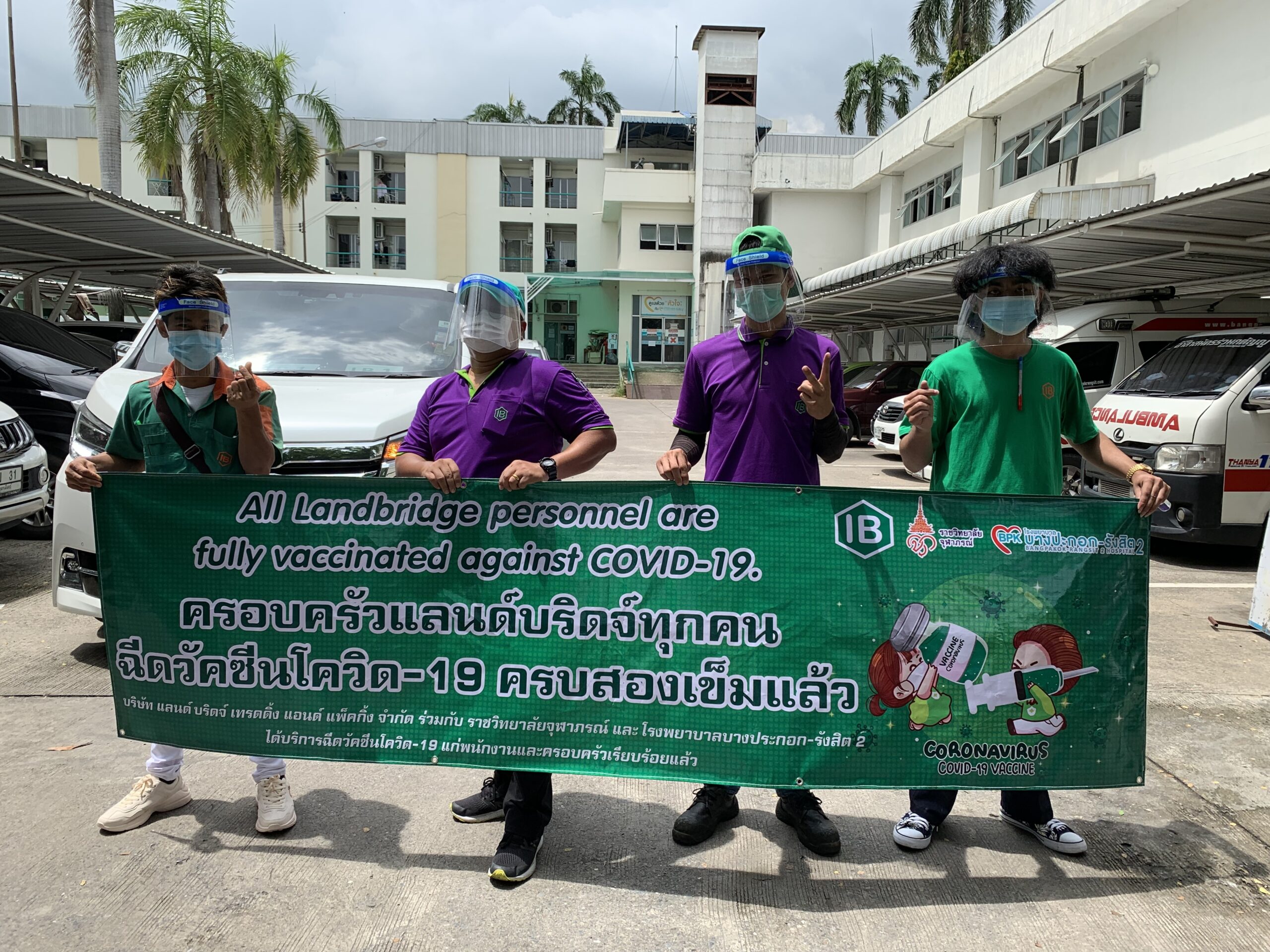 เราได้ร่วมมือกับ จุฬาภรณ์ราชวิทยาลัย และ โรงพยาบาลบางปะกอก-รังสิต2 ในการฉีดวัคซีนให้พนักงานของบริษัทโดยแพทย์ผู้เชี่ยวชาญ อีกทั้งยังเตรียมพร้อมอุปกรณ์ Personal Protective Equipment (PPE) ให้กับพนักงานทุกคนก่อนและหลังฉีดวัคซีน เพื่อป้องกันการติดเชื้อจากสถานที่แอดอัด และ ผู้คนพลุกพล่าน อ้างอิงจากคำแนะนำของ องค์กรอานามัยโลก และ ประกาศจากกระทรวงสาธารณสุขไทย และ กรมควบคุมโรค เพื่อความสบายใจและความปลอดภัยของพนักงาน บริษัท แลนด์ บริดจ์ เทรดดิ้ง แอนด์ แพ็คกิ้ง จำกัด