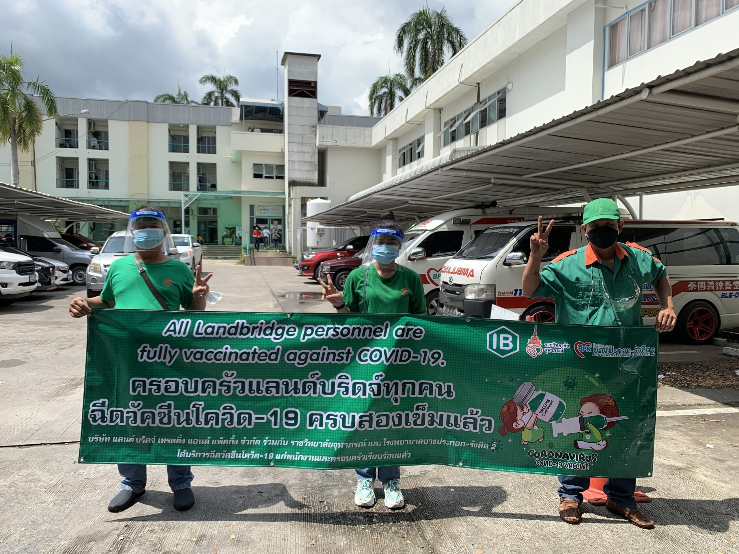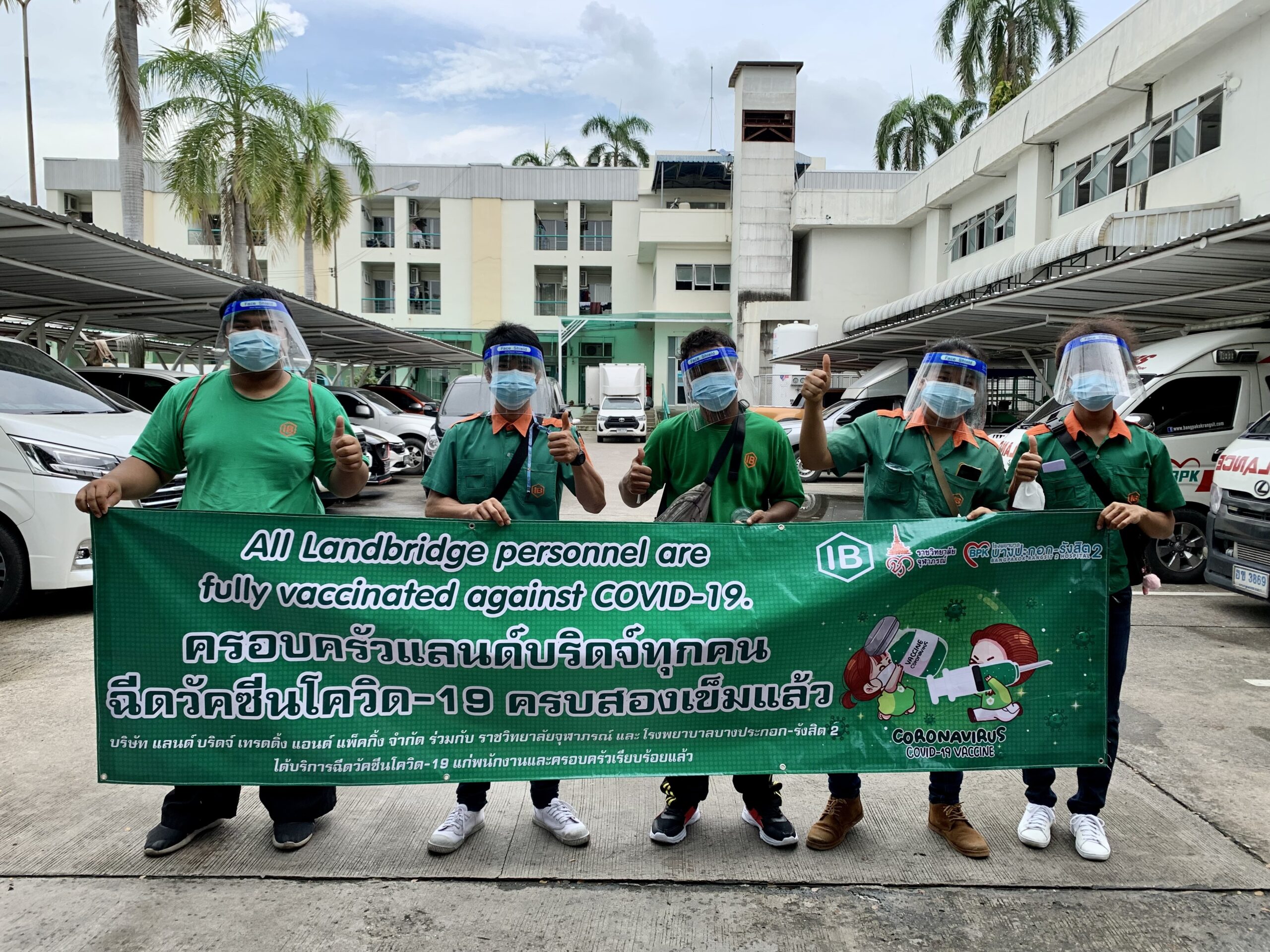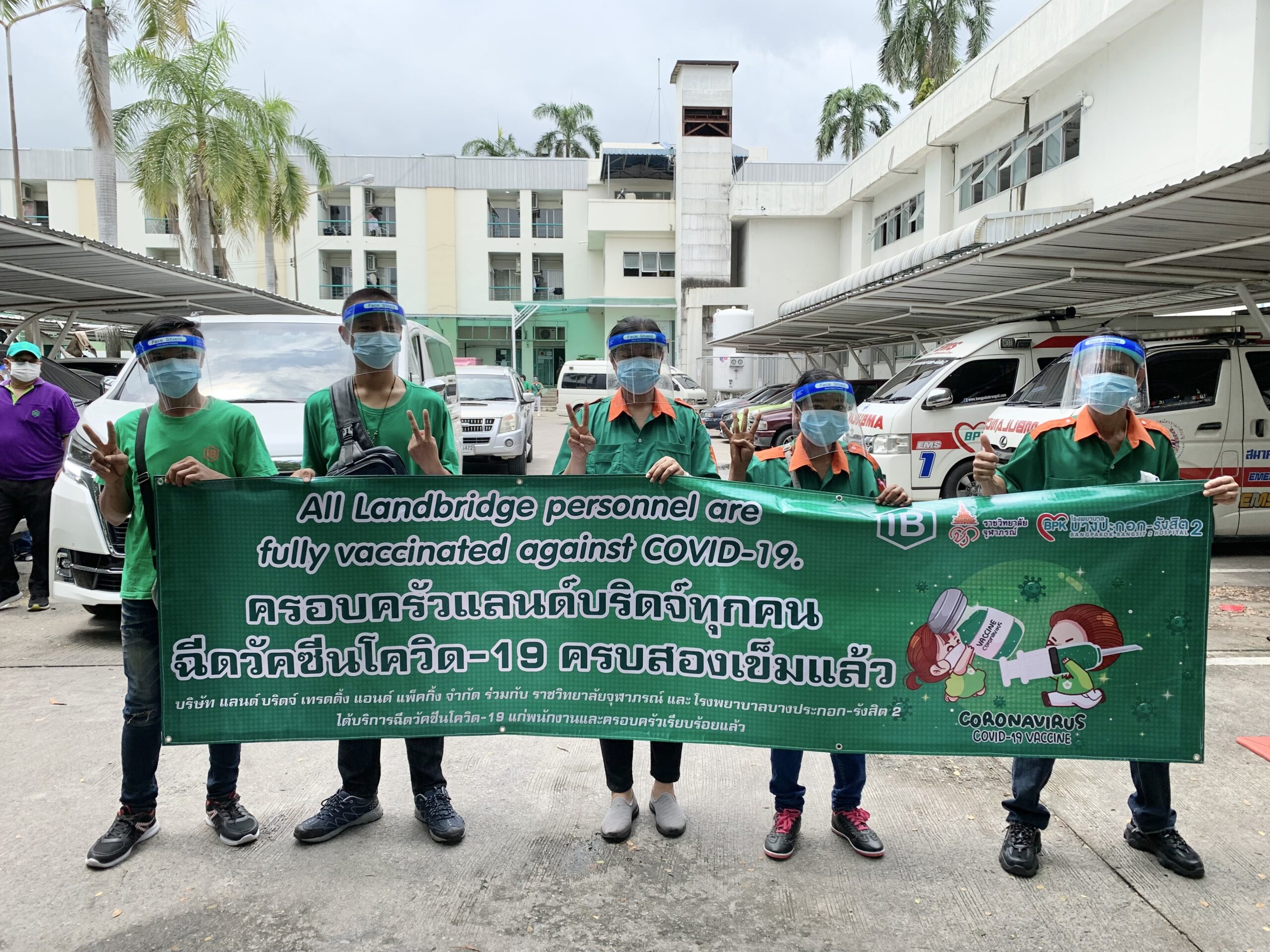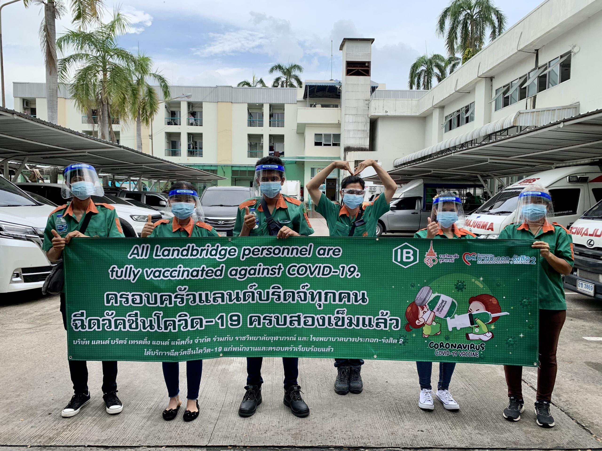 เราได้ร่วมมือกับ จุฬาภรณ์ราชวิทยาลัย และ โรงพยาบาลบางปะกอก-รังสิต2 ในการฉีดวัคซีนให้พนักงานของบริษัทโดยแพทย์ผู้เชี่ยวชาญ อีกทั้งยังเตรียมพร้อมอุปกรณ์ Personal Protective Equipment (PPE) ให้กับพนักงานทุกคนก่อนและหลังฉีดวัคซีน เพื่อป้องกันการติดเชื้อจากสถานที่แอดอัด และ ผู้คนพลุกพล่าน อ้างอิงจากคำแนะนำของ องค์กรอานามัยโลก และ ประกาศจากกระทรวงสาธารณสุขไทย และ กรมควบคุมโรค เพื่อความสบายใจและความปลอดภัยของพนักงาน บริษัท แลนด์ บริดจ์ เทรดดิ้ง แอนด์ แพ็คกิ้ง จำกัด